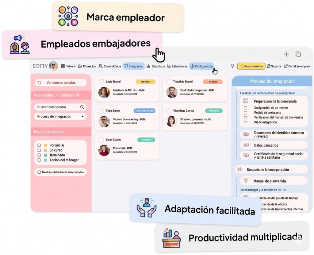 Softy combina estos diferentes pilares dentro de un mismo entorno: un sitio de empleo personalizable, un ATS completo, recorridos de candidato fluidos, una gestión estructurada del onboarding, módulos de comunicación de RR. HH. y paneles de control que permiten gestionar todas las métricas clave (origen de las candidaturas, tasa de conversión, engagement y calidad de las candidaturas).