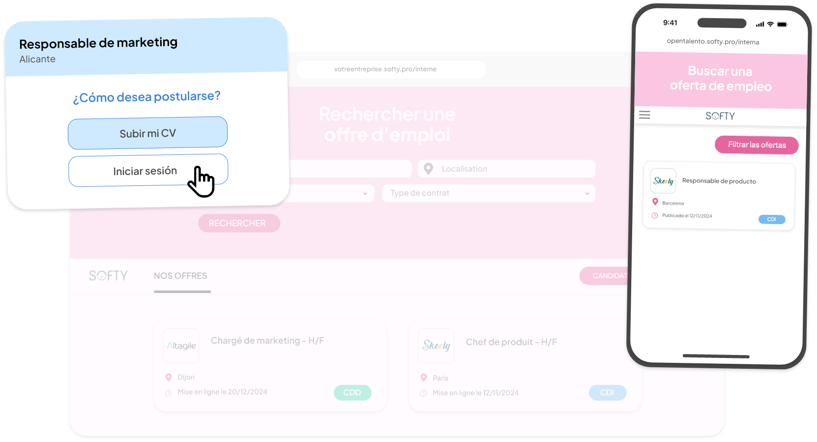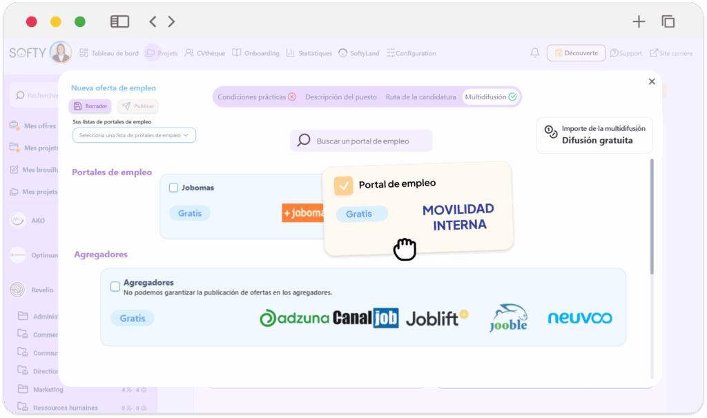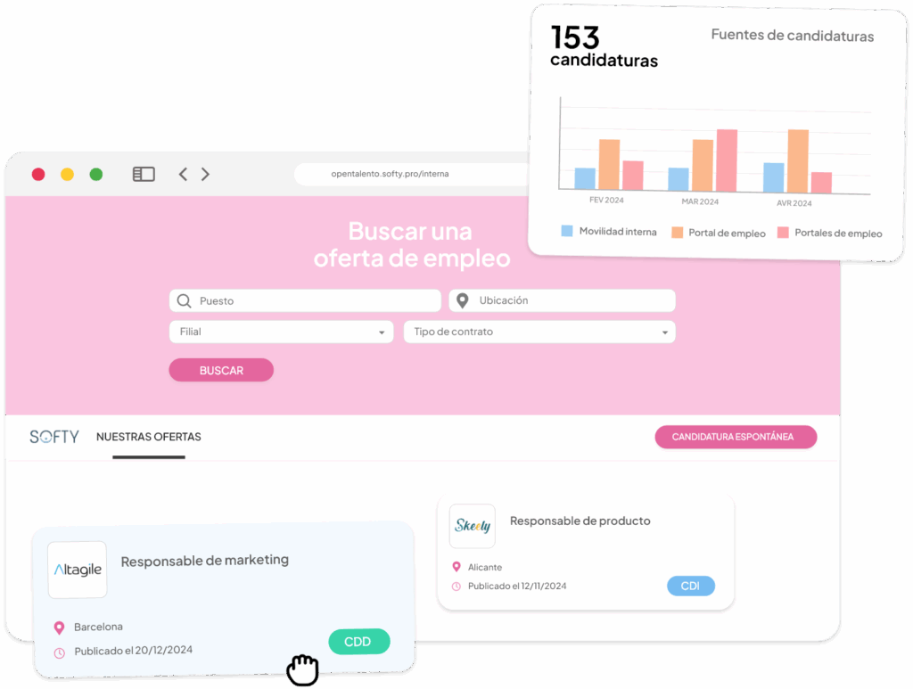 Vinculada al portal del empleo portal de empleo del ATS Softy, los colaboradores disponen de una página dedicada que agrupa todas las ofertas disponibles dentro del programa de movilidad interna.