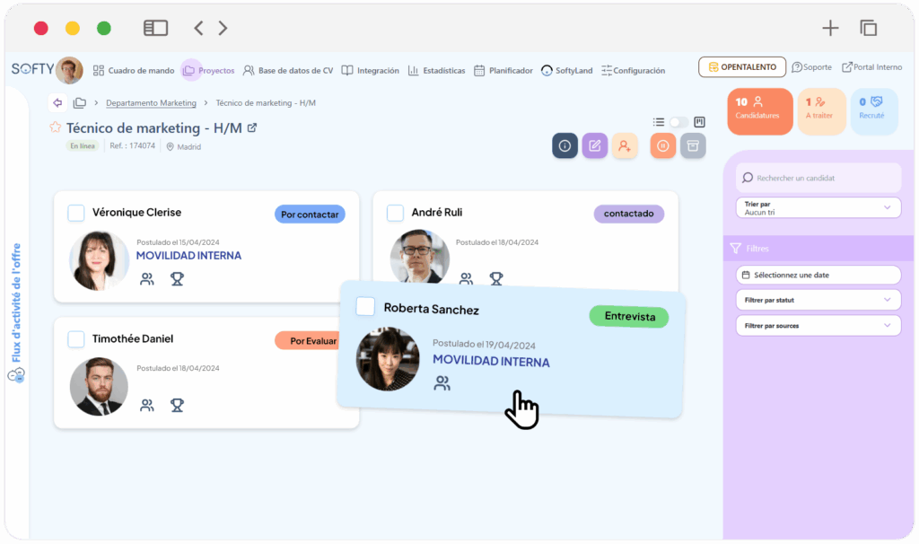 Todas las candidaturas internas son visibles directamente en el software de reclutamiento Softy.